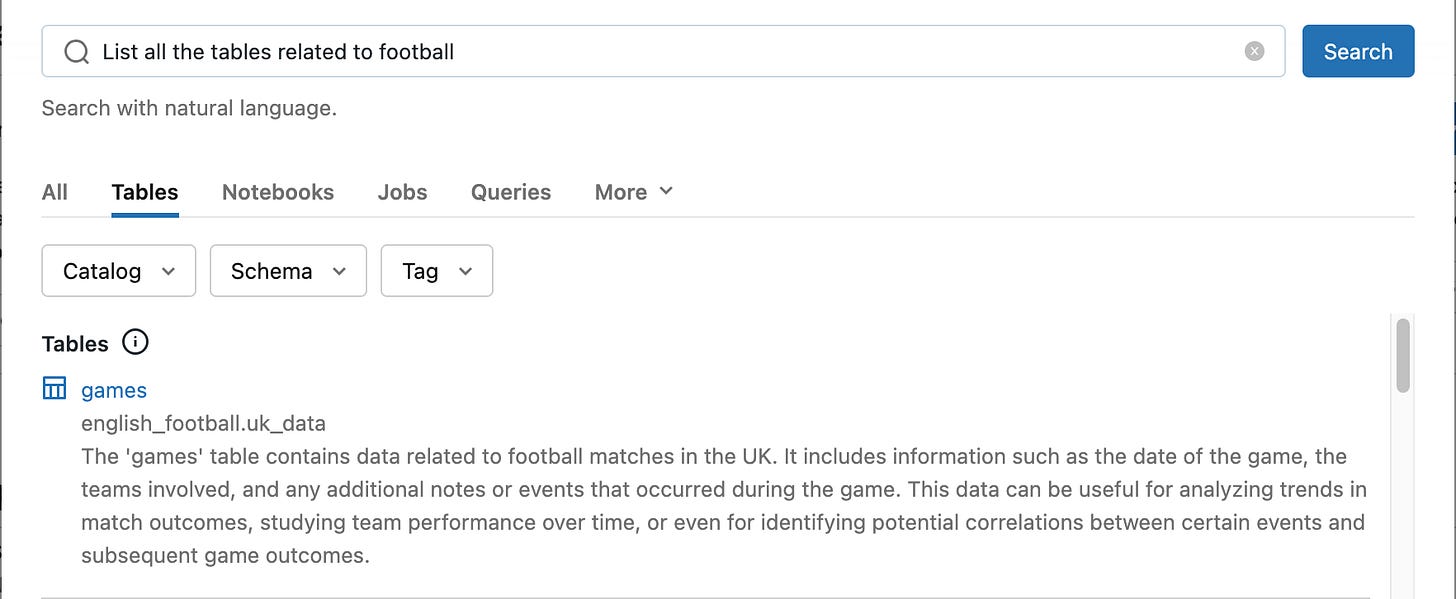 This will improve the new Semantic search capabilities, letting you ask questions on your lakehouse using plain text: (eg: List all the tables related to football)