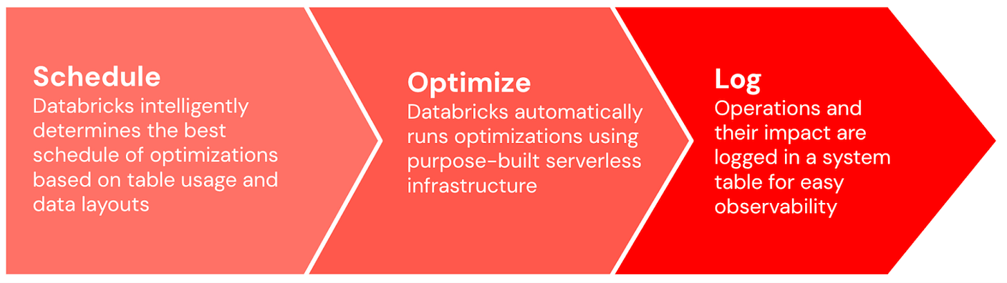 Predictive Optimization leverages Unity Catalog and Lakehouse AI to determine the best optimizations to perform on your data, and then runs those operations on purpose-built serverless infrastructure (VACUUM, OPTIMIZE…). This significantly simplifies your lakehouse journey, freeing up your time to focus on getting business value from your data.