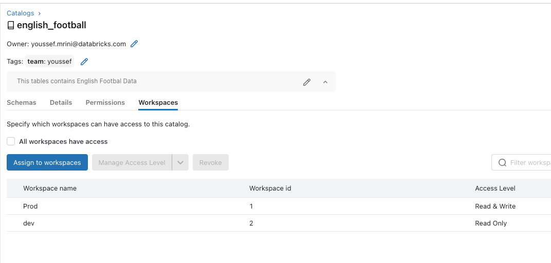 While Metastore can be shared across multiple workspaces, you can now bind a catalog to a specific workspace, preventing it to be READ or WRITE from other workspace (ex: “Development” workspace can only READ the “prod” catalog)